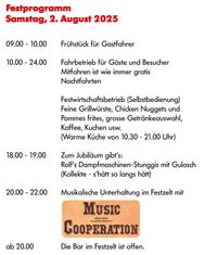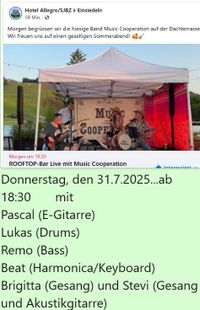 MUSIC COOPERATION ist ein Duo bestehend aus Stevi (Gitarre, Gesang, Mundharmonika und Perkussion) und Pretty Brigitta (Gesang). Die "kleine Band" existiert seit 2009 (vorher MC GOOD FRIDAY). Sie werden für eine gute Stimmung in einer freundschaftlichen Atmosphäre sorgen. Rock’n Roll, Blues, Country von den 50er bis 80er Jahren. Cover Music und Songs zum Mitsingen. Gastmusiker: Pascal (E-Gitarre), Vladan (E-Gitarre), Speedy (Mandoline und Bass). Beat (Harmonika, Gitarre, Keyboard ...)